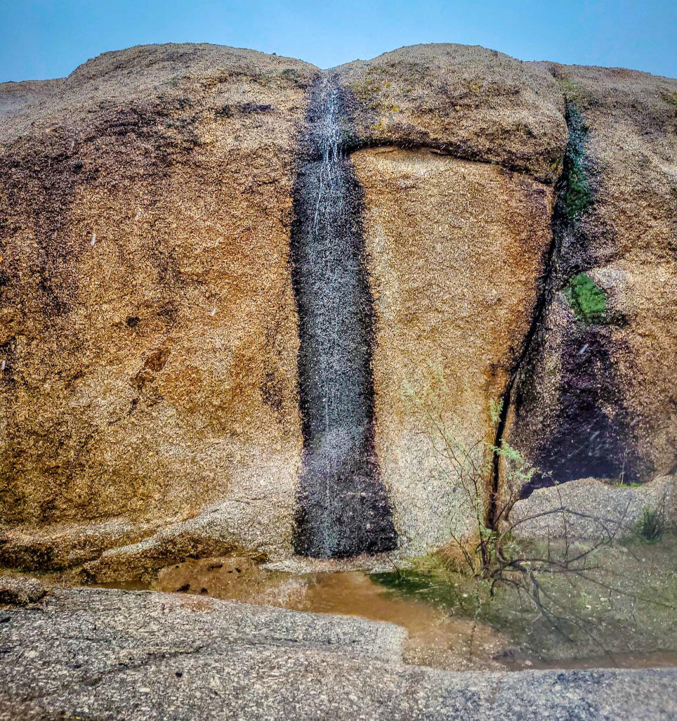 Below, water runs down grooves on the huge granite rock, and then over
