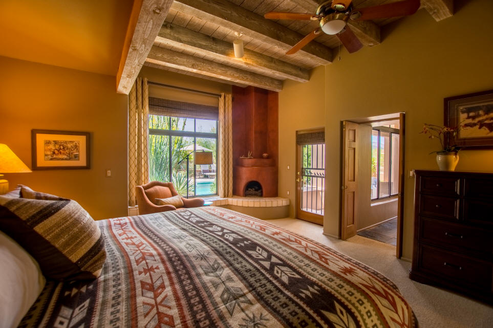 wood burning fireplace, Italian porcelain tile, viga beam Southwest