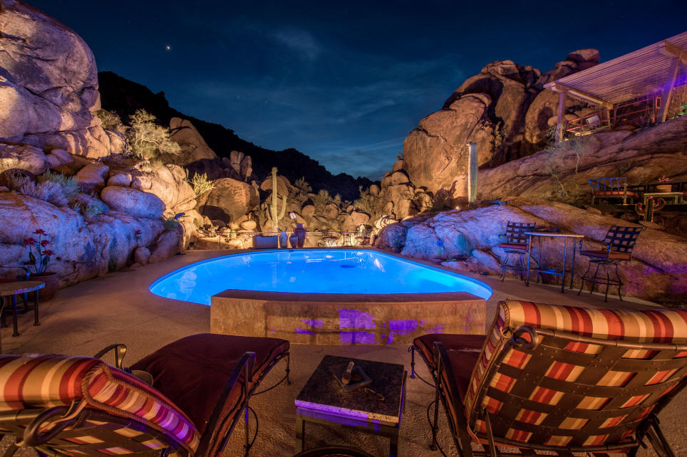 of a castle. Rock cliffs by the pool have multiple sitting areas as you